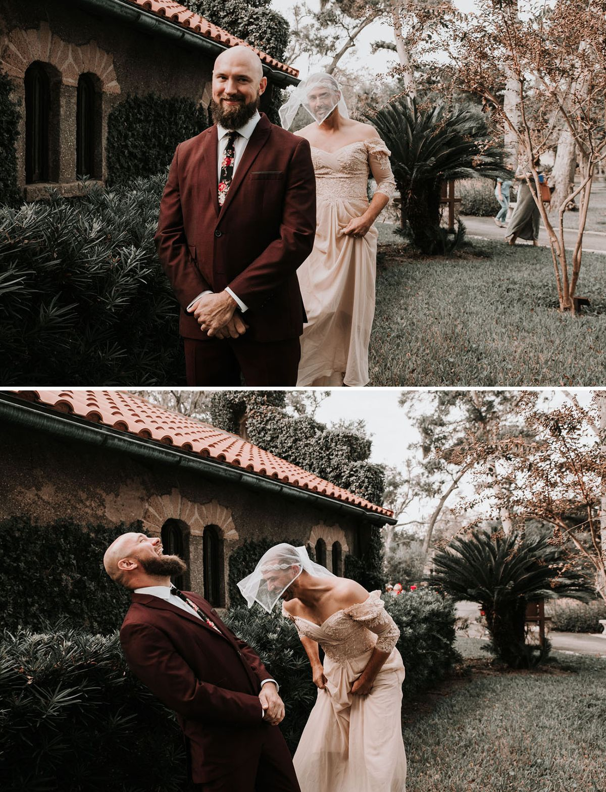Add some light-hearted fun by throwing in a decoy. It could be a friend in a costume, a sibling in a veil, or even the best man in a wig. The surprise adds humor before the real reveal—and breaks any tension with a good laugh.
